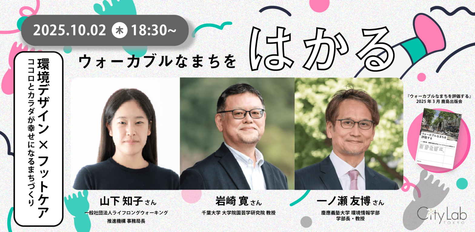 本セッションでは、横断的・統合的な研究成果をまとめた書籍『ウォーカブルなまちを評価する』(2025年3月、鹿島出版会)を起点に、歩くためのココロとカラダという視点から、環境デザインや地域ケア、フットケアに現場で関わる実践者の取り組みを通してディスカッションを行います。