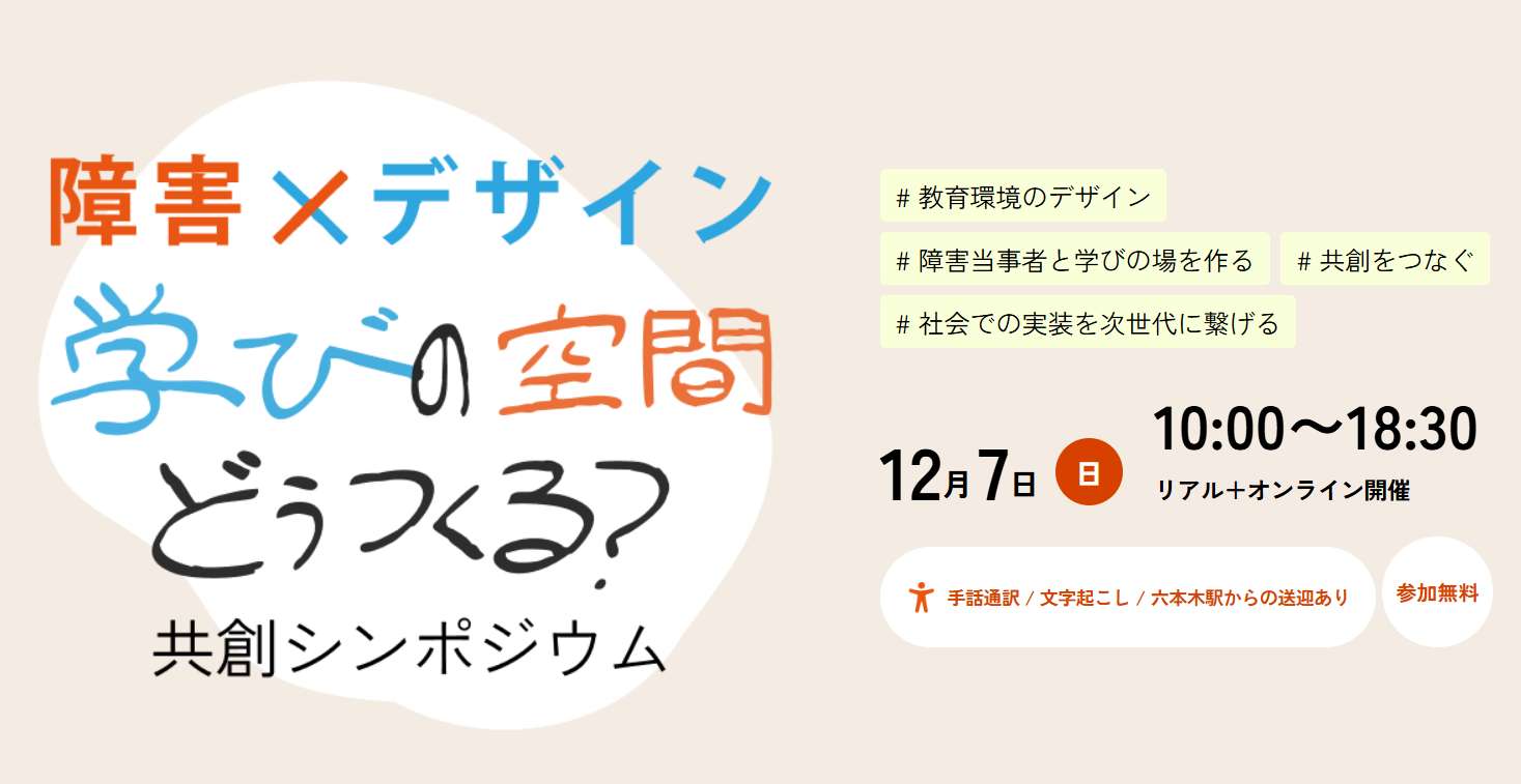 日本財団DIVERSITY IN THE ARTSと多摩美術大学、一般社団法人ドリフターズ・インターナショナルは、2025年12月7日(日)に、インターナショナル・リエゾンセンター(東京ミッドタウン・デザインハブ内)において、「障害」と「デザイン」の関係性のこれからを育むため、1日の参加型シンポジウム「障害 x デザイン|学びの空間どう作る? 共創シンポジウム」を開催します。