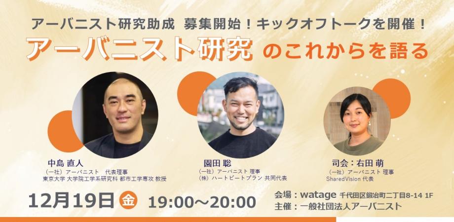 今回は、この助成プログラム開始に伴い、キックオフトーク「アーバニスト研究のこれからを語る」を開催致します!アーバニスト代表理事の中島直人・理事の園田聡が登壇し、昨今の都市計画・まちづくり界隈でのアーバニストへの注目状況や、それらを踏まえた研究の重要性・必要性について語り、アーバニスト研究の機運を高めていきます。