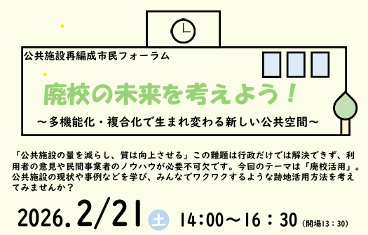 これからの公共施設の在り方をみんなで「学び・考える」、公共施設再編成市民フォーラムを開催します。廃校を新たな公共資源と捉え、新しい価値を共に創造していきましょう。