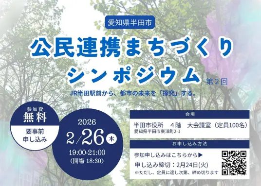愛知県半田市にあるJR半田駅周辺では、鉄道高架化と土地区画整理事業という、都市構造の転換期を迎えています。真に持続可能なまちをつくるためには、建物や道路のハード整備だけではなく、エリアの価値を高める経済循環を生み出すことが重要です。本シンポジウムでは、公民連携の最前線を走る専門家を招き、行政による基盤整備と、民間が切り拓く「稼ぐまち」の可能性を多角的に紐解きます。