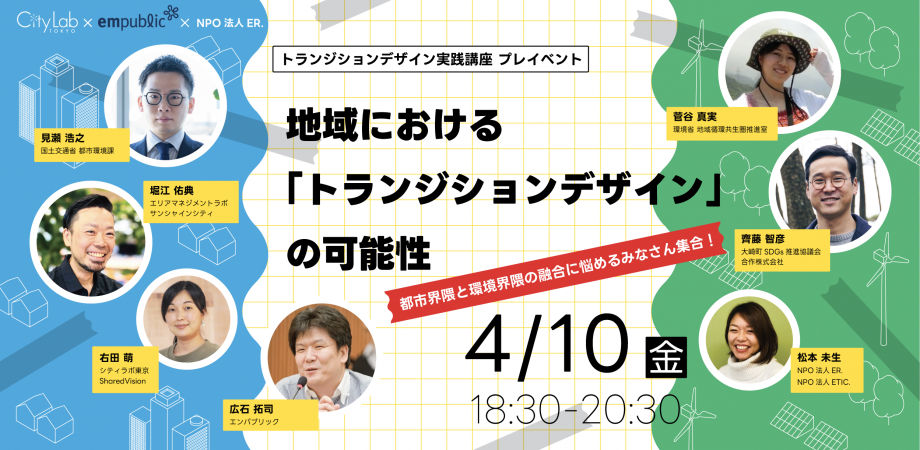 | 登壇者 | 見瀬 浩之 [国土交通省都市局都市環境課] 菅谷 真実 [環境省大臣官房地域政策課地域循環共生圏推進室] 齊藤 智彦 [合作株式会社代表取締役/彫刻家] 堀江 佑典 [一般社団法人エリアマネジメントラボ 理事/株式会社サンシャインシティ まちづくり推進部 エキスパート/andscape] 広石 拓司[エンパブリック代表取締役、ソーシャル・プロジェクト・プロデューサー] 松本 未生[NPO法人ER.代表理事/NPO法人ETIC. コーディネーター] 右田 萌[シティラボ東京 マネージャー(一社アーバニスト理事)/SharedVision 代表] |