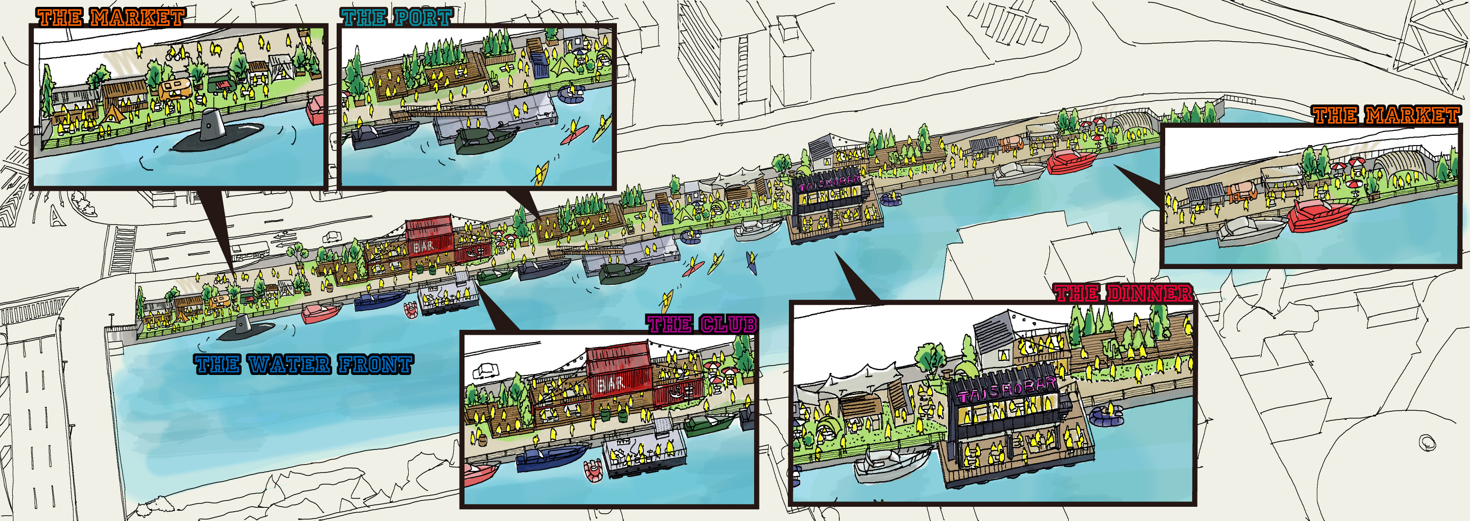 例えば、水上でレストランを営業したり、大正や都心部をぐるっと周遊するクルージング事業を行ったり。水辺らしく、アウトドアで食事を楽しめるBBQ場や屋台をやるにもぴったりです。