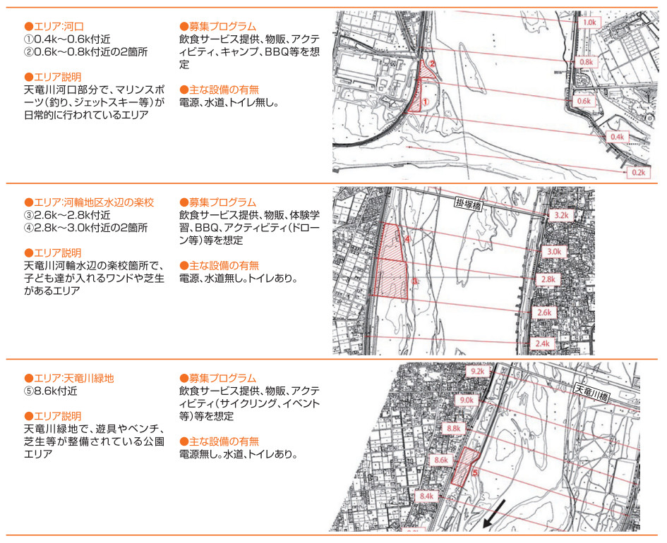 対象となるエリアは、天竜川右岸約8キロに渡る、「河口」「河輪水辺の楽校」「天竜川緑地」の3エリア。