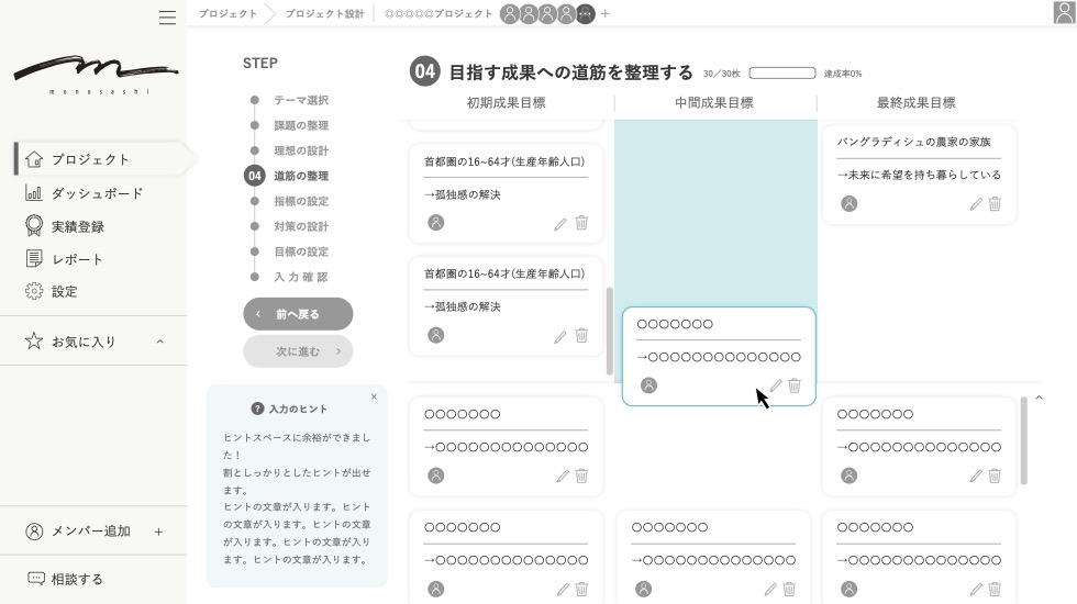 次に自分たちが目指す成果を初期と中期に分けて書く欄があって、そこを埋める。さらにやるべきことを細かく入力していく。要は手順に沿ってやれば誰でも簡単に書けるんですが、実際には最初の計画通りにものごとって進まないじゃないですか。