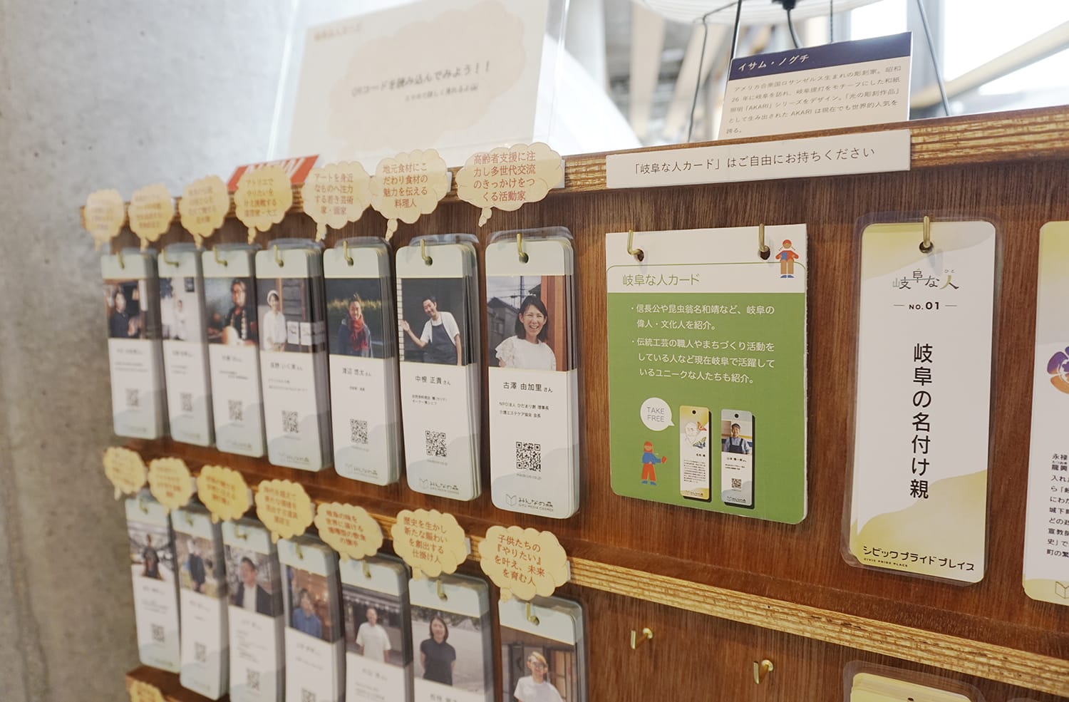 岐阜で活躍する人を紹介するエリア。過去の偉人と並列して、現在岐⾩で活躍している伝統工芸の職人やまちづくりのプレーヤーなどを紹介するカードが並ぶ。名所や絶景だけでなく「人に会いに行く」という新しい観光の提案でもあるかもしれない。