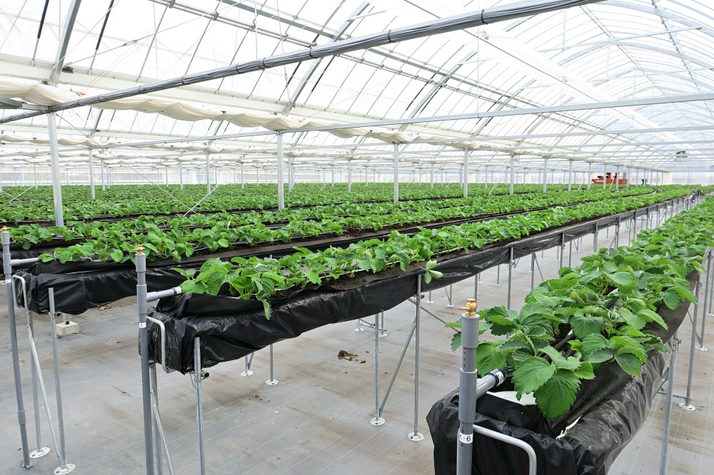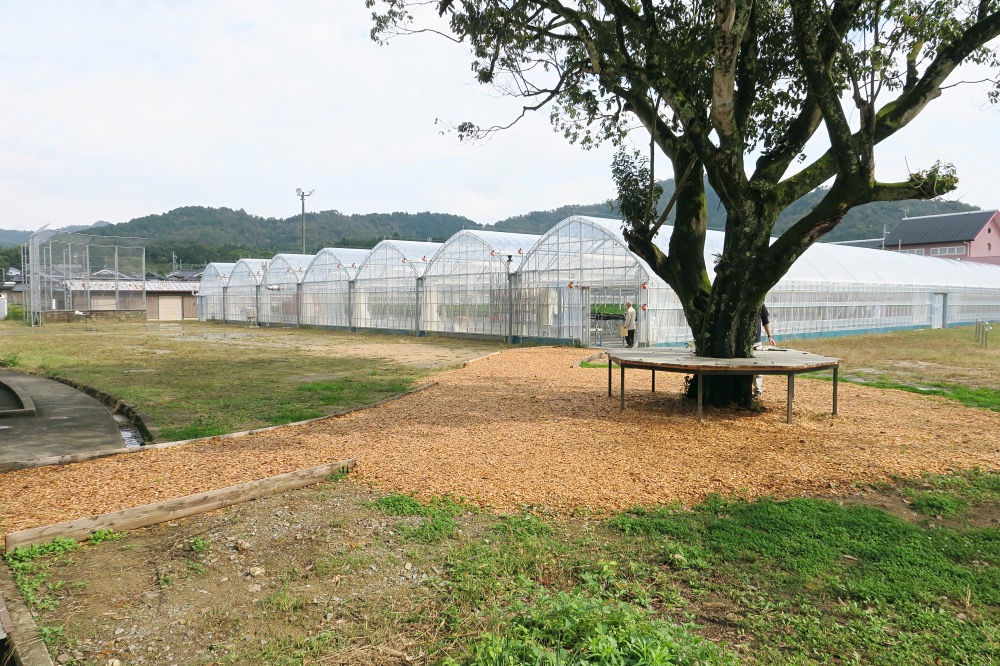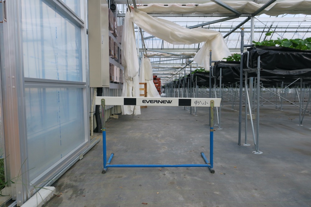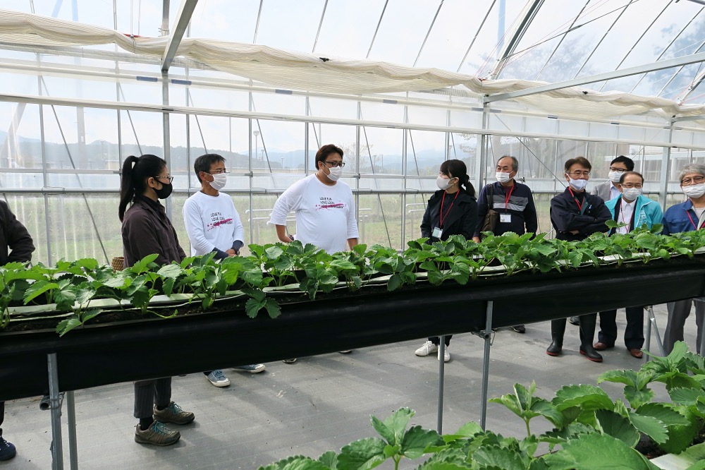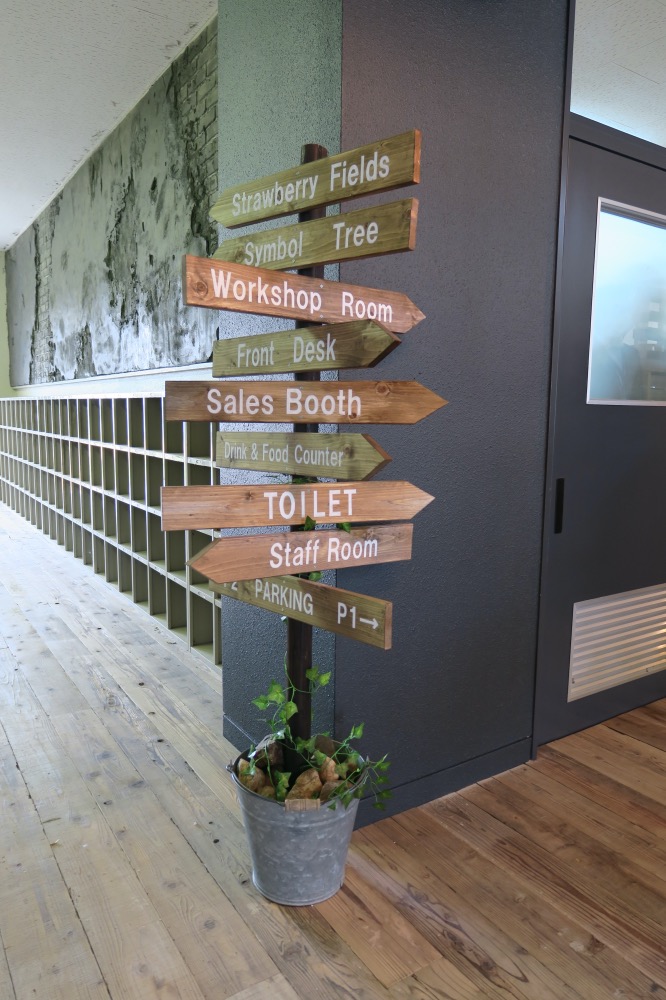 廃校ツアーの合間には、実際に廃校を活用されているいちご農園の企業訪問も行われました。ここは廃校になった中六人部小学校、教室の一部を事務室に、さらにグラウンドに大きなビニールハウスを作りいちごの温室栽培をされていました。エントランスもご自分達の企業イメージを表現するようにリノベーションされています。雨の日には結構ぬかるんでしまうグランドもウッドチップを敷き詰めることでその問題を解決されていたり、立ち入り禁止のところにはハードル走のハードルが置かれていたり、元々階段の蹴上げの部分にあったナンバリングに苺のマークがプラスされていたりと、小学校が持つ楽しいエッセンスも上手に活用されていたのが印象的でした。