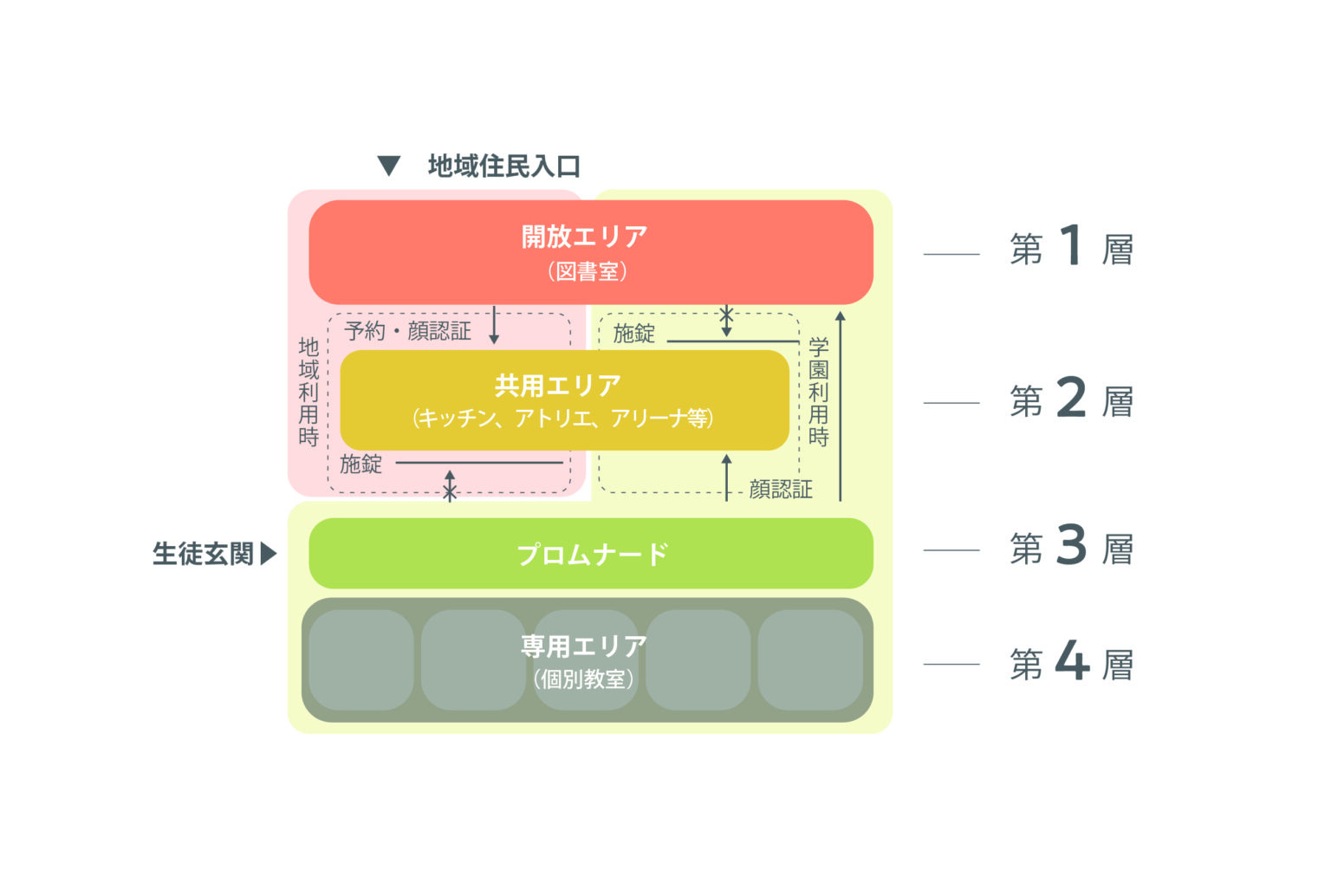 子どもは児童生徒玄関から、地域の方は地域玄関から入ります。セキュリティとしては顔認証システムを取り入れていて、児童生徒は顔認証で自由に行き来できますが、地域の方は2層目まで。3層目以降はガラス越しに様子が見える設計です。