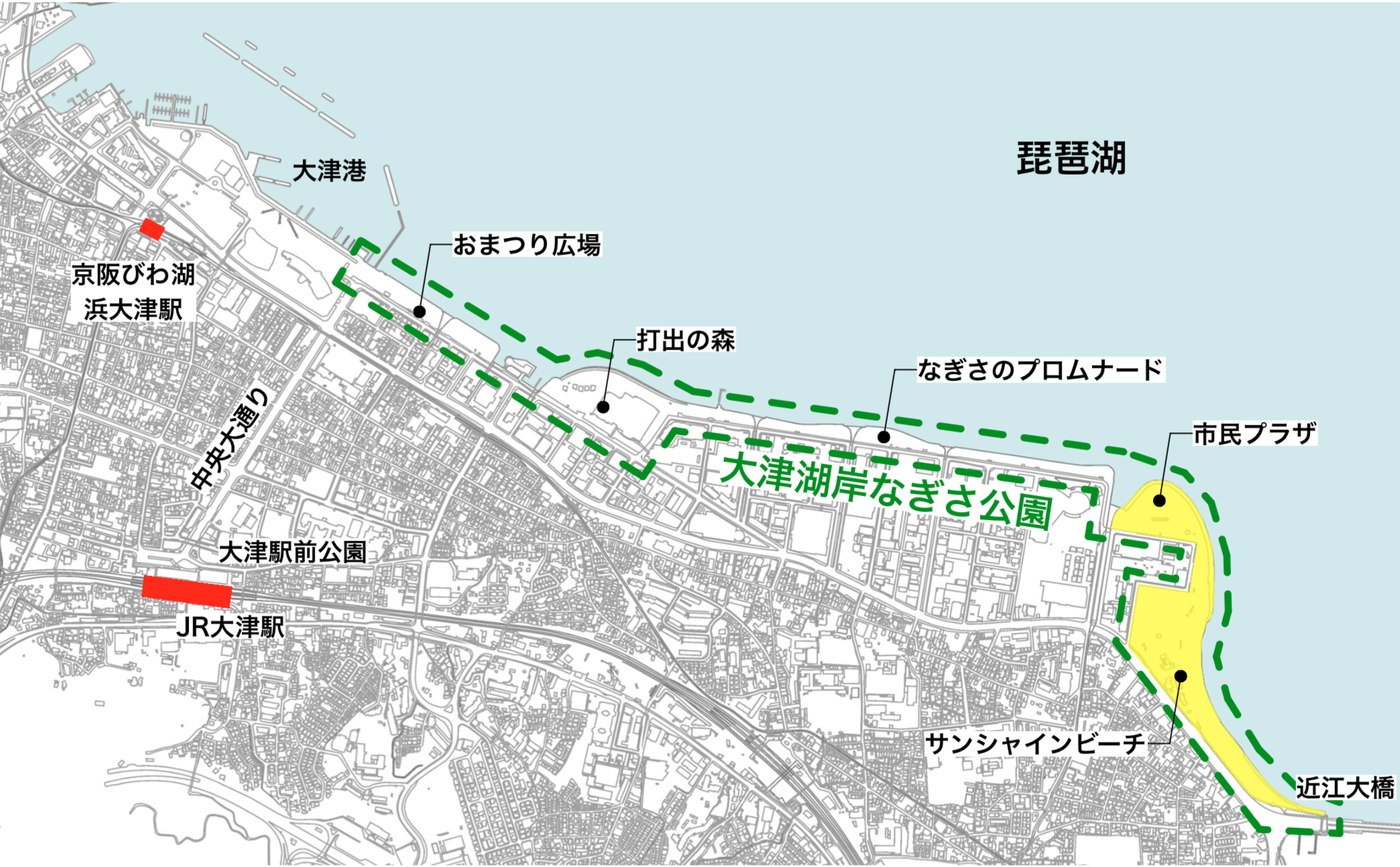 6セクションに分かれ、それぞれにゆるやかな活用方針が定められています。昨年度は、中でも公園の玄関部分にあたる「おまつり広場」についてのマーケットサウンディングを実施。さらに、JR大津駅と琵琶湖をつなぐ「ジュネーブ構想」に基づき、駅から湖に歩を進めるきっかけとなるよう、駅前公園でもサウンディング&事業者募集を行い、併せて、この11月より、公園前の車道2車線を歩道化する工事が開始される予定です。