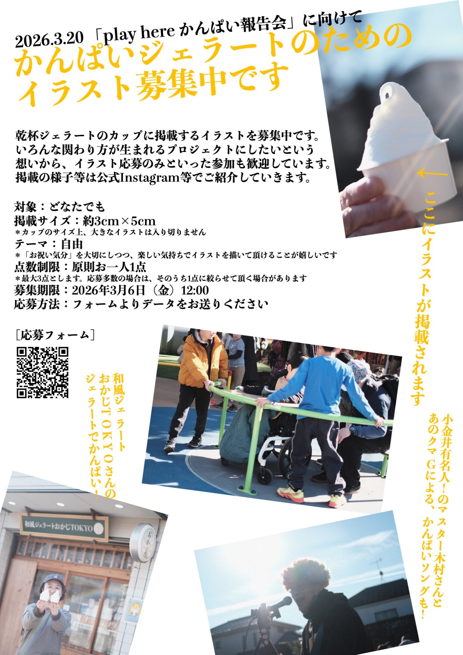 「play here かんぱい報告会」に向けて、かんぱいジェラートのためのイラスト募集中です。応募頂いたイラストは、乾杯ジェラートのカップに掲載します。いろんな関わり方が生まれるプロジェクトにしたいという想いから、報告会への参加は問わず、イラスト応募のみといった参加も大歓迎しています。