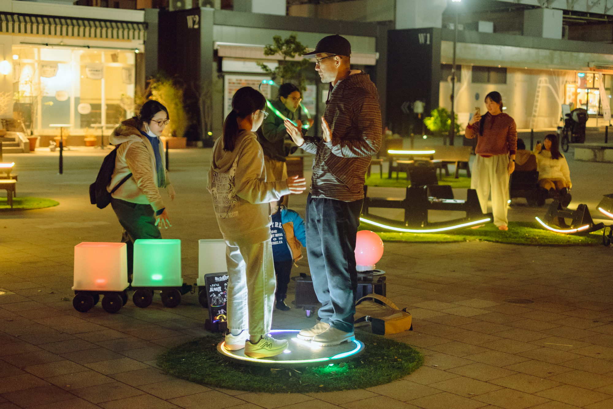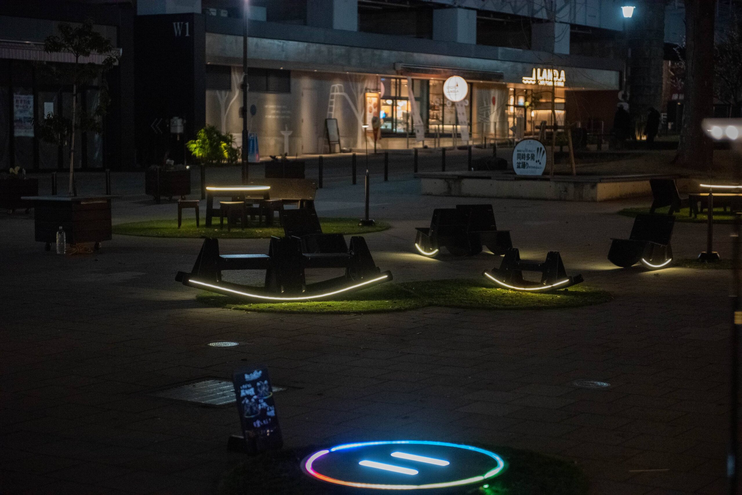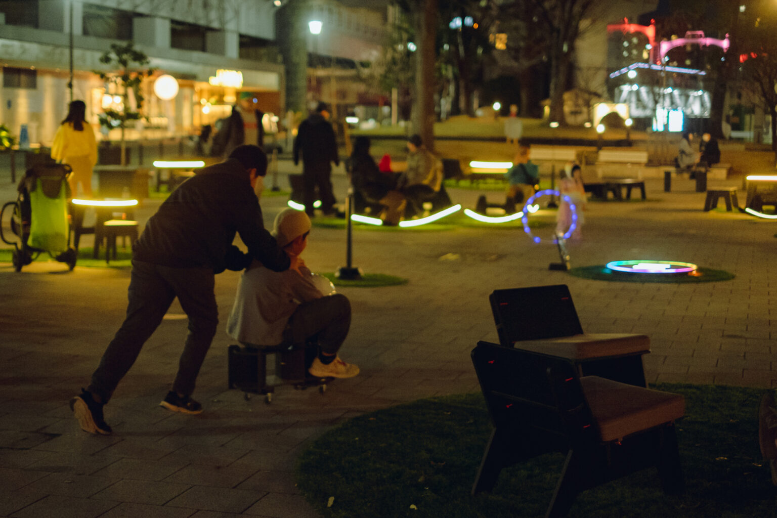 夜になると、「Night Park(ナイトパーク)」として、ファニチャーが光りはじめます。テーブルや椅子など、ファニチャーのひとつひとつが光ることで暗くても居場所が際立ち、夜でも滞在しやすくなりました。今回新たに制作した「光る土俵」は七色に光り、「なんだこれ?」と子どもも大人も吸い寄せられる大人気のコンテンツになっていました。