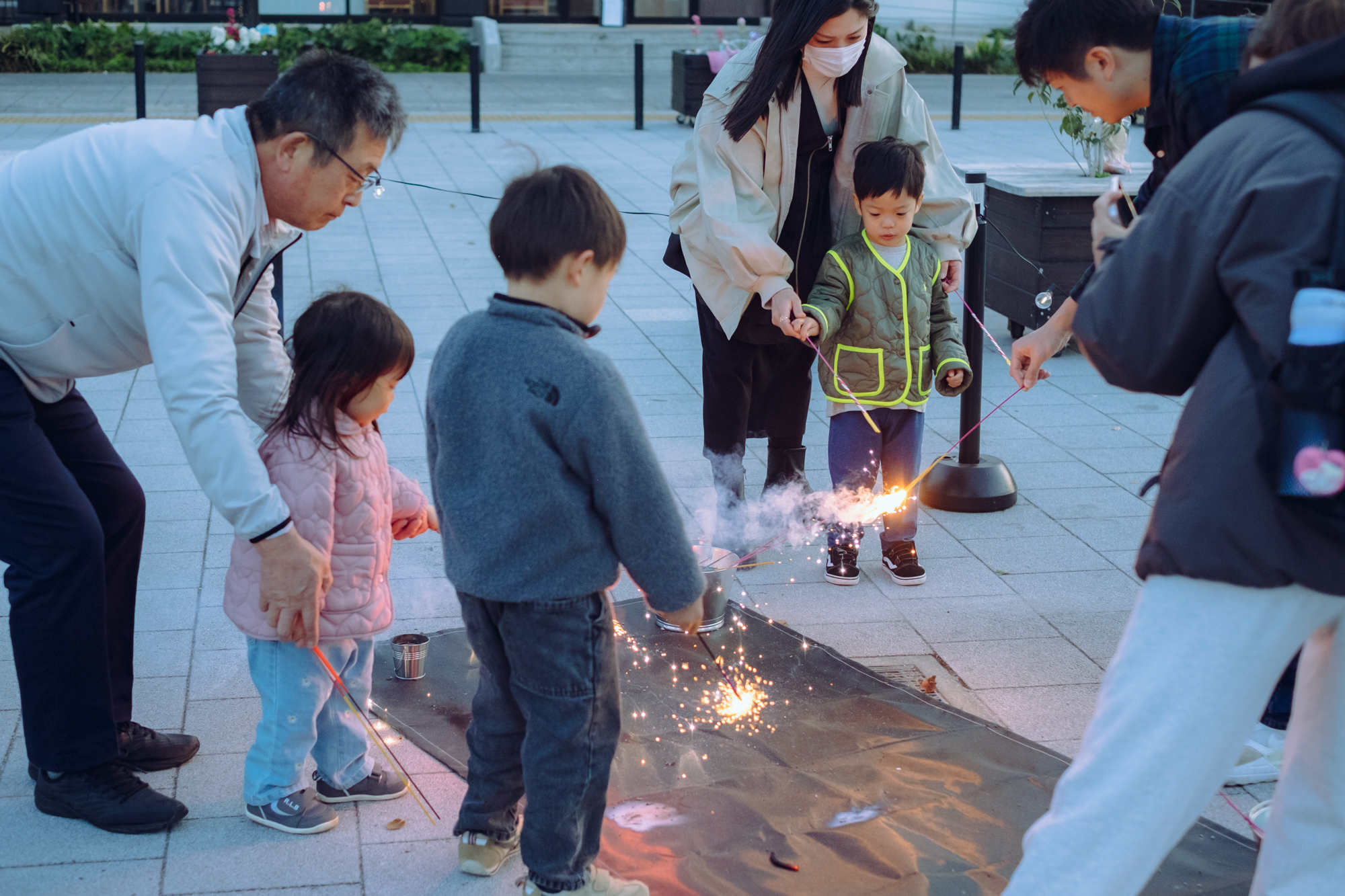 火を囲むと、自然と見ず知らずの人同士で会話が生まれていました。中には、スマートフォンの翻訳アプリを使いながら外国の方と会話を楽しんでいる方も。手持ち花火を見たフランスの方から「これは一体何の慣習ですか?」という質問を受けたり、「一人で来たのだけど子どもにあげたい」と見ず知らずの子に花火をプレゼントしたりする方もいらっしゃいました。まさに多様性が交差する空間であり、焚き火や花火には、新しい人に出会うきっかけや「公共的」な要素が十分にあると感じました。