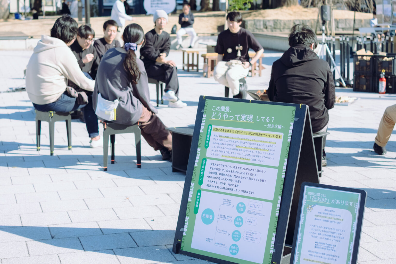 今回は、冬の公園における滞在性を高める仕掛けとして「焚き火」と、夜の公園を楽しむアイテムとして「手持ち花火」の実施にトライしました。公園の禁止事項トップクラスな火の扱いですが、実際に火を焚いてみると、焚き火が持つ「人を惹きつける力」に驚かされました。