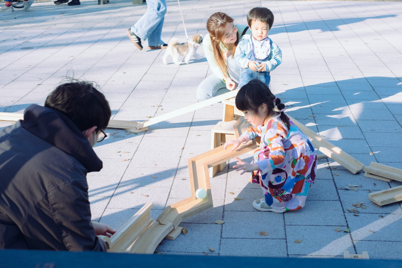部材は自由に切り出し加工ができるため、ゆらゆら揺れる木馬などの遊具も登場。子どもたちが揺れる遊具で楽しんだり、車輪付きのおもちゃでたくさん遊んだりする姿も印象的でした。