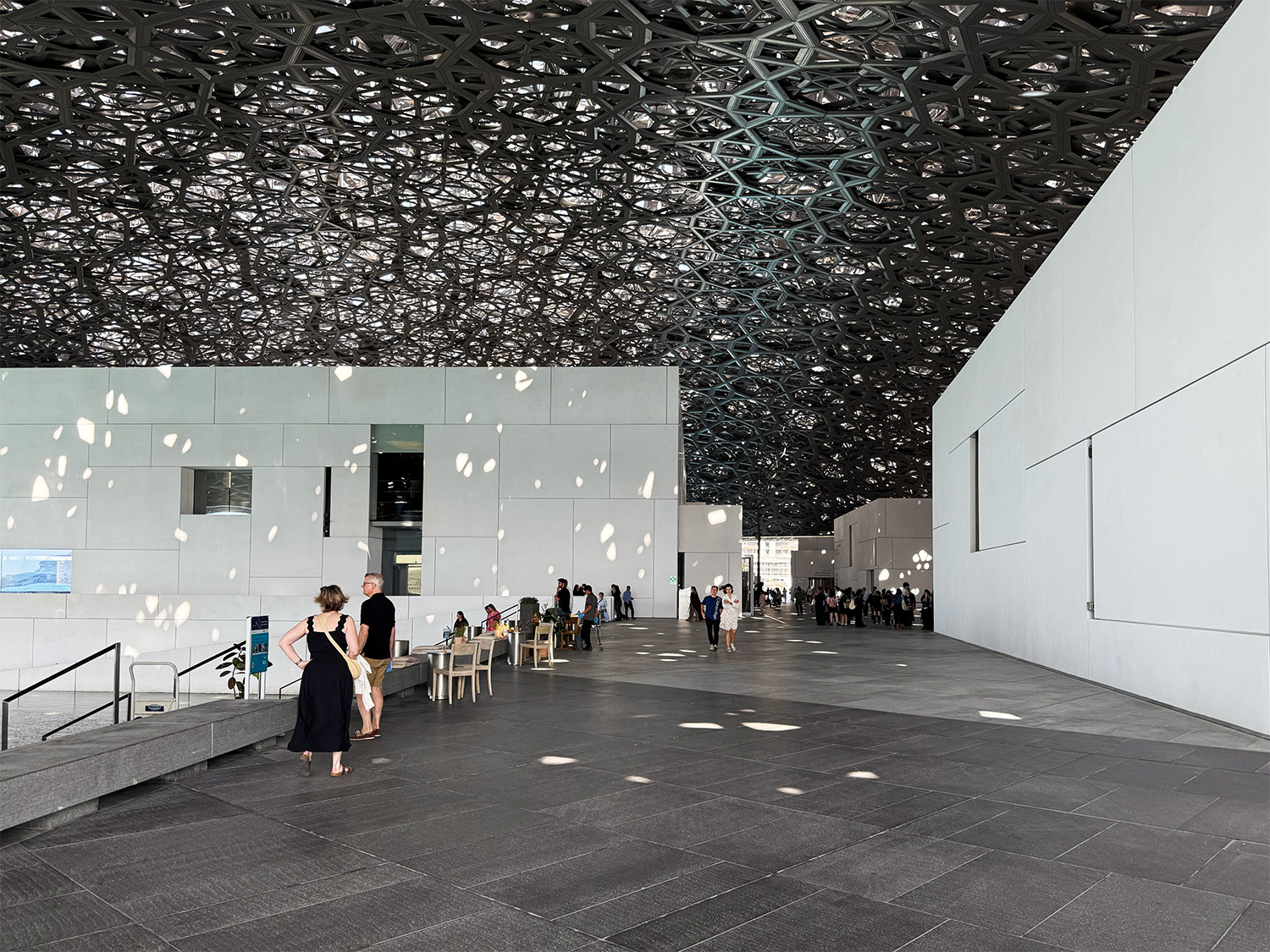 それは現代建築でも同様です。ルーブル美術館の分館として知られるルーブル・アブダビ(ジャン・ヌーヴェル設計)は、アラブの入り組んだ市街地「メディナ」を想起させる低層建築群が、巨大なドーム屋根で覆われています。このドームはレイヤー構造になっており、自然光を屈折させて取り入れることで、明るさを保ちつつ、暑さを軽減しています。その屋根の下を海風が通り抜けるため、半袖では肌寒く感じるほどでした。