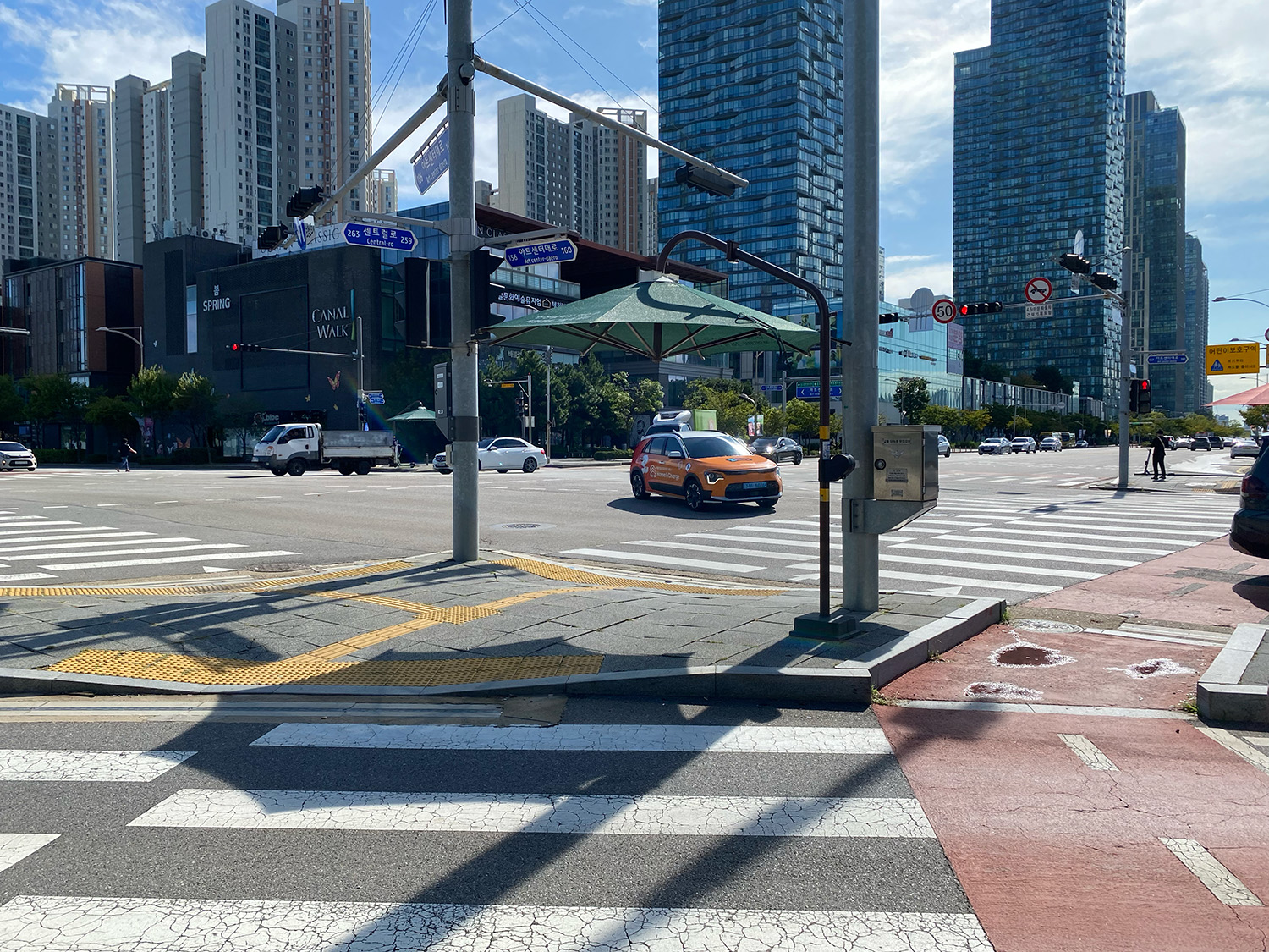 市内の交差点の至るところにパラソルが設置されており、信号待ちの時間を日陰で過ごすことができました。実際にパラソルの下に入ってみると涼しく、信号待ちのストレスが軽減されているように感じました。