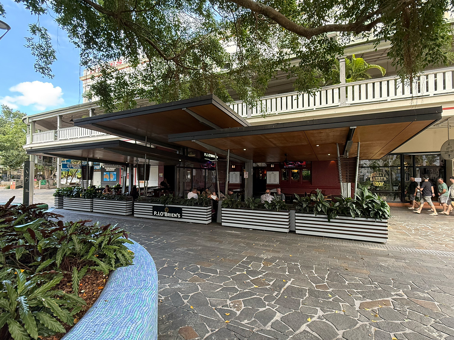 非常に紫外線が強いオーストラリアでは、国を挙げて紫外線対策に力を入れており、そのひとつとして日陰の確保が重視されています。赤道に近く、オーストラリアの中でも紫外線の強いクイーンズランド州北部のケアンズもまた日陰の多い街でした。メインストリートは建築と一体となった大きな庇がかかり、多くの人が日陰を歩いています。一方で、日向で過ごすのが好きな人も多いようで、日当たりのいいベンチに座っている人々も多く、気分や天気に応じて日陰と日向を使い分けているように思いました。