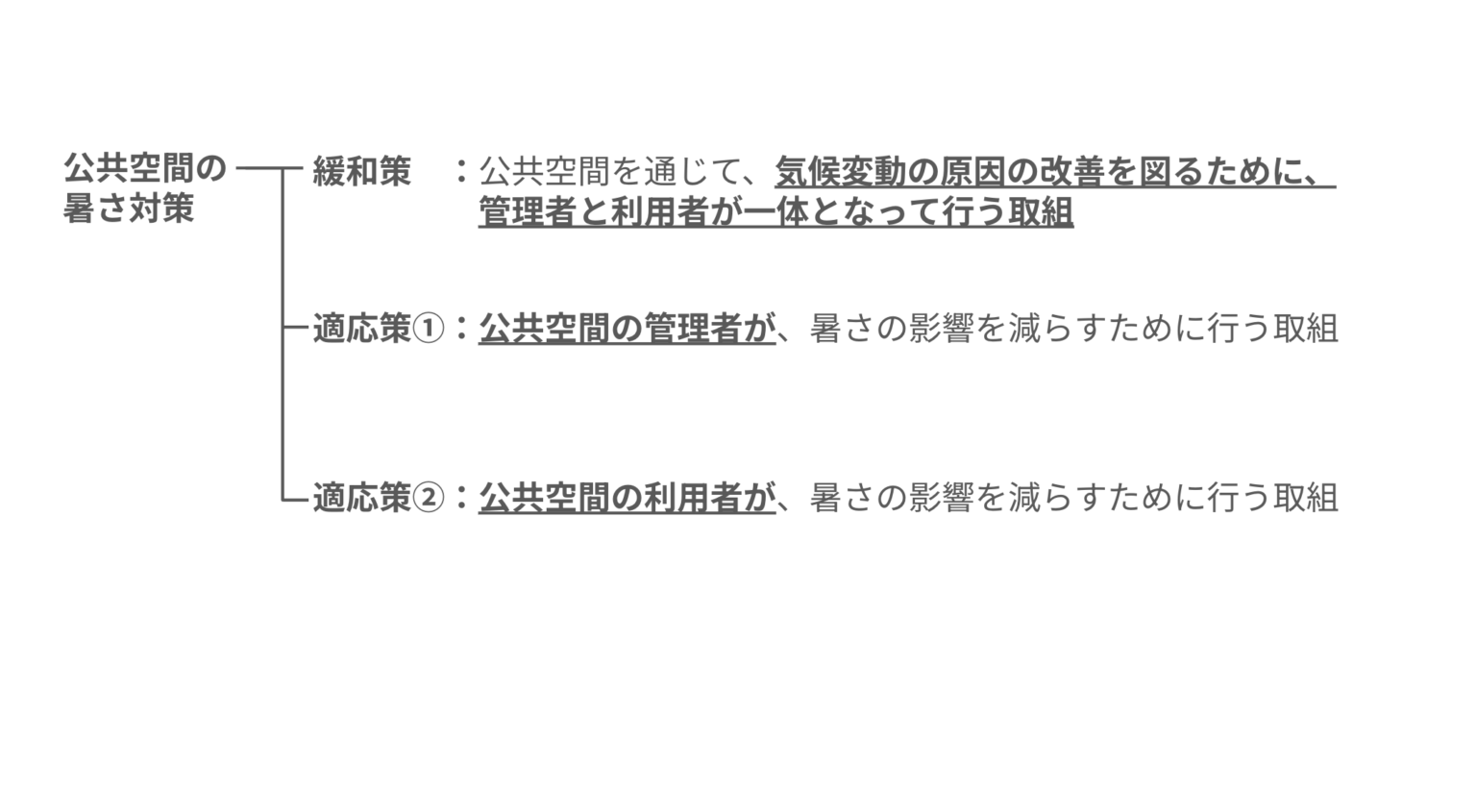 私たちは、まちづくりにおける暑熱対策は緩和策にも繋がると考えており、もう少し幅を広げて、緩和策と適応策両方に注目していきます。また、緩和策は管理者と利用者が一体となって行う取組中心で、適応策は管理者が主体となって行う取組と、利用者のライフスタイルや使い方に関する取組があると考えられるため、適応策については管理者と利用者それぞれの視点から考えていきます。