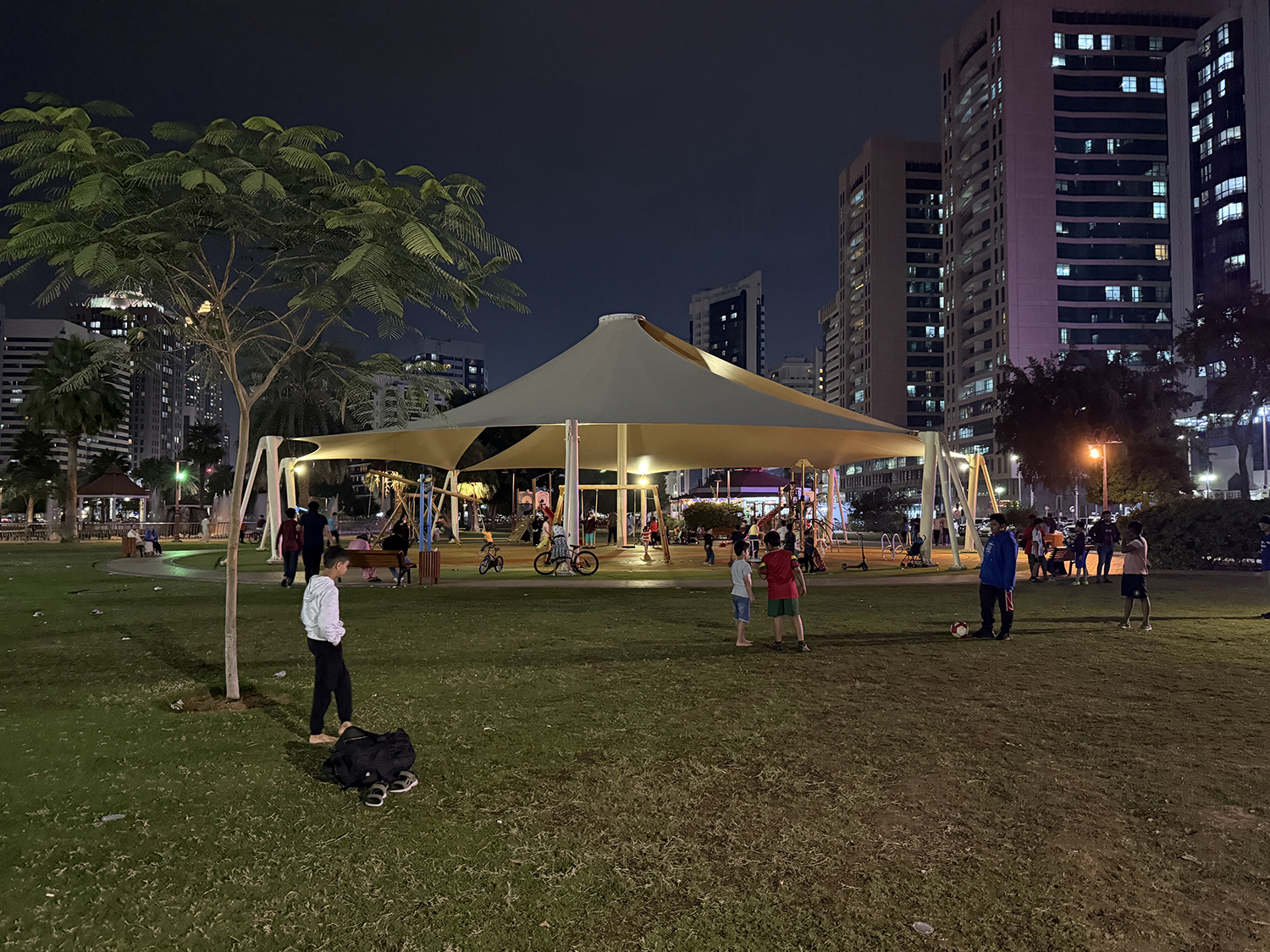 市内の公園では、屋根が設置された遊び場が多く、昼間でも日陰で遊ぶことができます。さらには、夜9時ごろでも子どもたちが遊具やサッカーで遊んでいました。このように、暑い時間を避けて公共空間を使うライフスタイルが当たり前になっていることが伺えました。