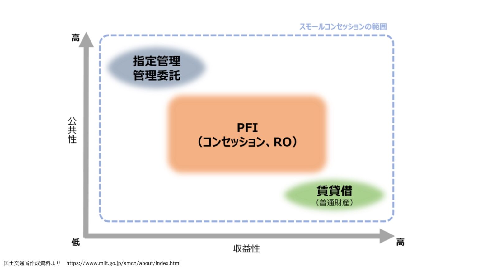 もうひとつは、2024年から国土交通省が用いている広い意味での使い方で、コンセッション方式だけでなく、指定管理者制度や普通財産の貸付なども含めた小規模な遊休公共不動産の民間活用全般を指します。