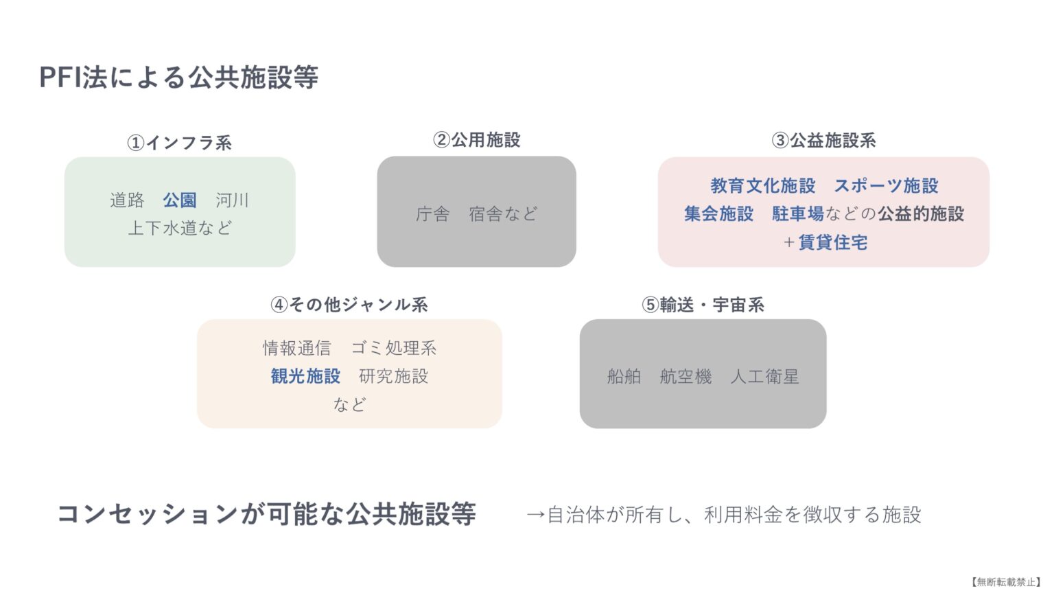つまり、コンセッション方式は「公の施設」の枠外にある行政財産・公共用財産の範囲で組み立てるのが向いている、ということになります。