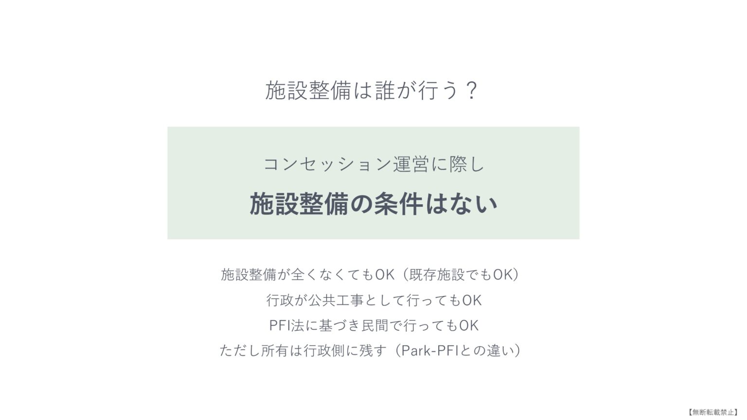 あと、よくある誤解として、コンセッションは大規模な改修(ハード整備)とセットだと思われがちですが、ハード整備の有無に関わらず、既存施設の運営権だけを切り出してコンセッションに移行することも可能です。