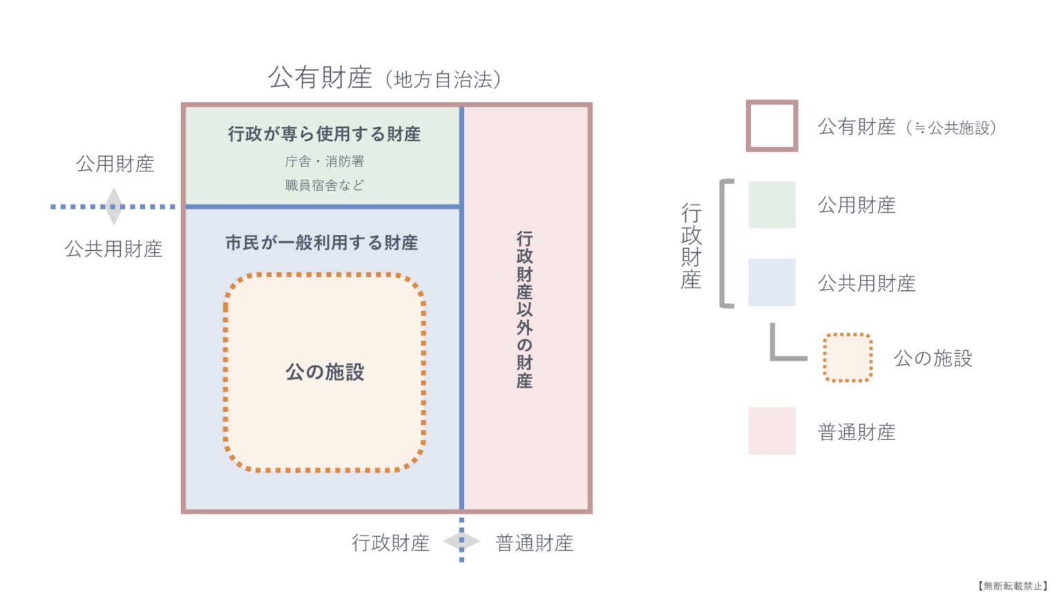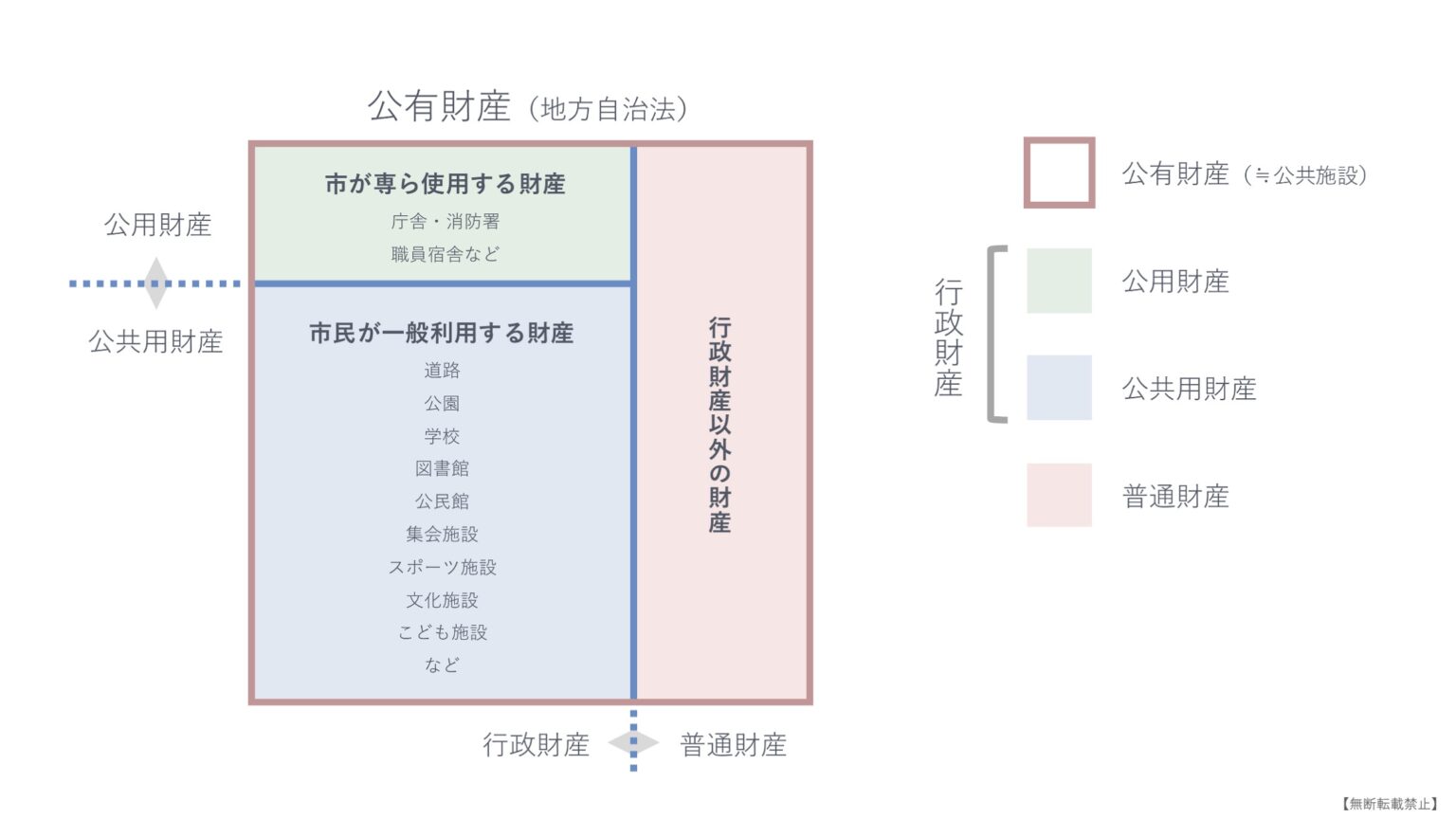 自治体が所有する財産は、「行政財産」と「普通財産」に区分されます。道路、公園、学校、図書館といった住民が利用する施設の多くは「行政財産」です。
