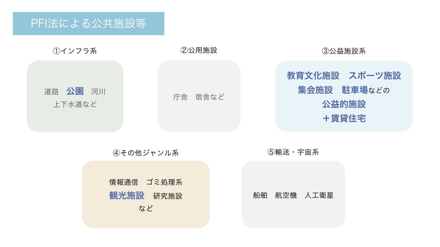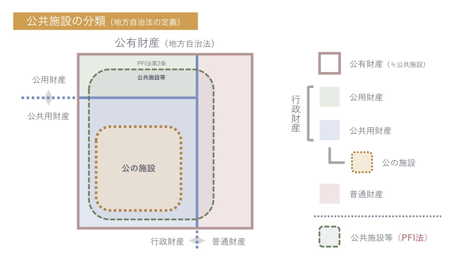 夏野さん それから、落とし穴-3で紹介されていた、川口さん作の「公共施設の重ね図」とその解説は、すごいです。地方自治法の「公有財産」「公の施設」、PFI法の「公共施設等」の関係性が一目で分かりました。
