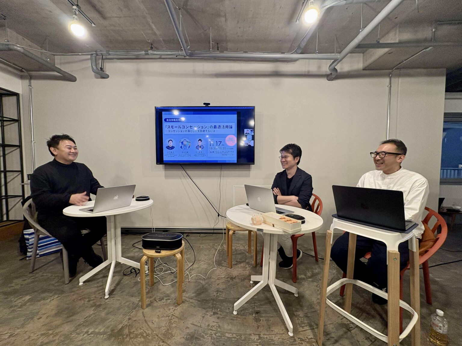 「スモールコンセッション」の名前が付く以前から、岡山県津山市で実践を重ねてきた川口義洋氏をメインスピーカーに迎え、研究所メンバーの矢ヶ部慎一・宮本恭嗣が深掘りしつつ進行した約2時間。単なる制度解説ではなく、「コンセッションの5つの落とし穴」をまるでパズルのように解いてゆく面白さに満ちたセッションとなりました。